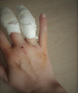 Après il a déballé et il a dit « Ah ouais… » Je pense qu’il a été subjugué par des mains si belles et gracieuses (des années de piano, je savais que ça paierait un jour). Alors il a dit qu’il allait aplatir mes phlyctènes et j’ai bien compris que c’était pas un truc sexuel. Il a anesthésié mes pauvres doigts, il m’a fait un peu mal mais il s’est pas excusé (je crois qu’il est timide aussi) (d’ailleurs il a dû s’en vouloir parce qu’il a quitté la pièce sans me regarder, je l’ai pas revu pendant au moins 15 minutes, à mon avis il n’osait pas revenir le petit chou). Après il est revenu il a fait je-sais-pas-quoi-j’ai-pas-regardé. Il a un peu juré en refaisant les poupées, sans doute parce qu’il sentait la fin de la consultation arriver et qu’il savait qu’il ne me verrait plus jamais jamais, jamais. Alors il a tenté une invitation au restau à peine masquée au milieu de sa prescription : « Mangez calorique et buvez beaucoup ». Non?